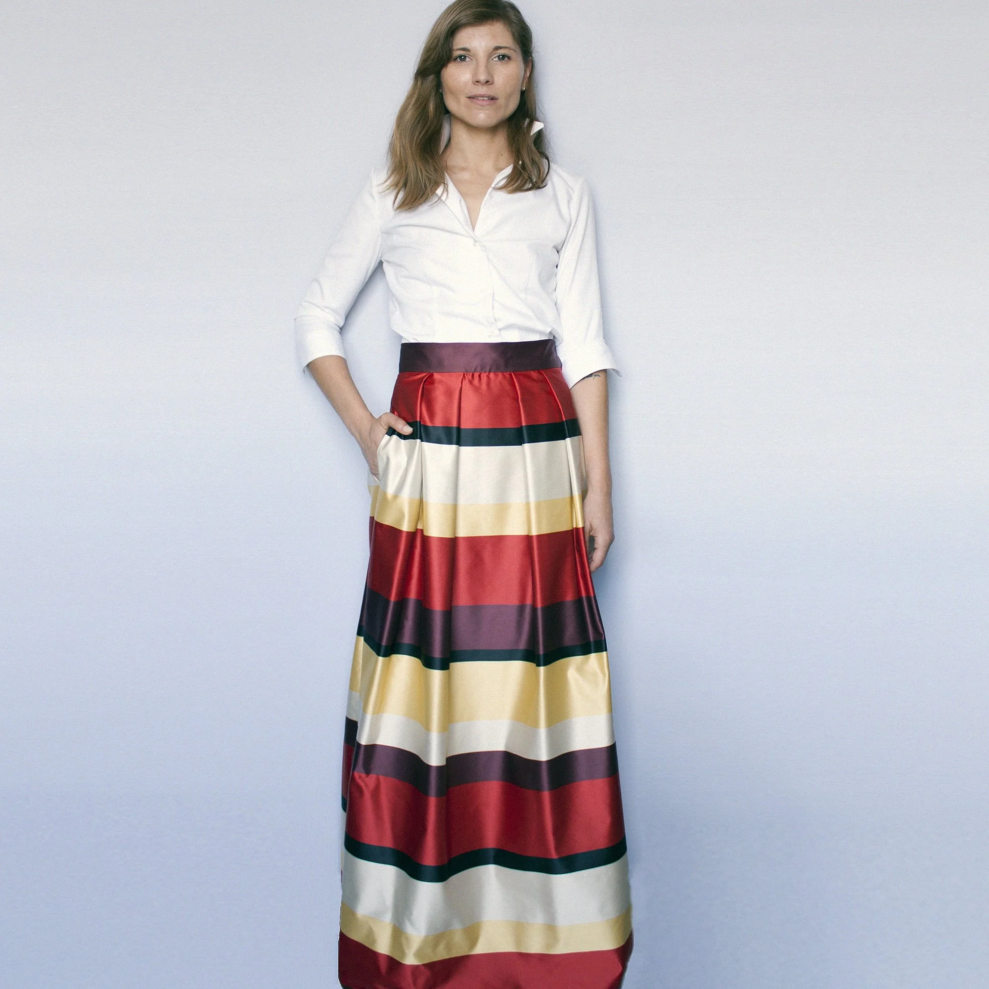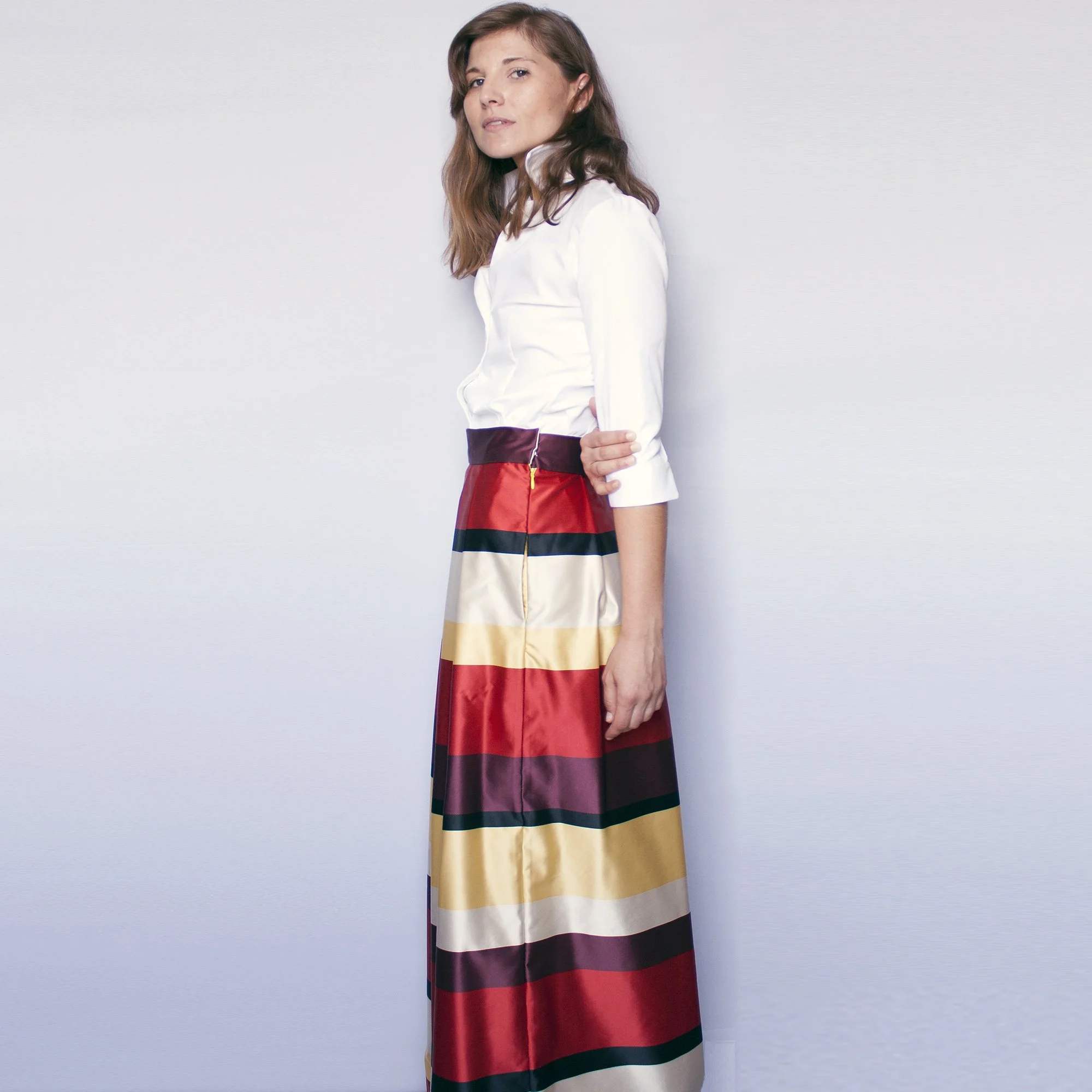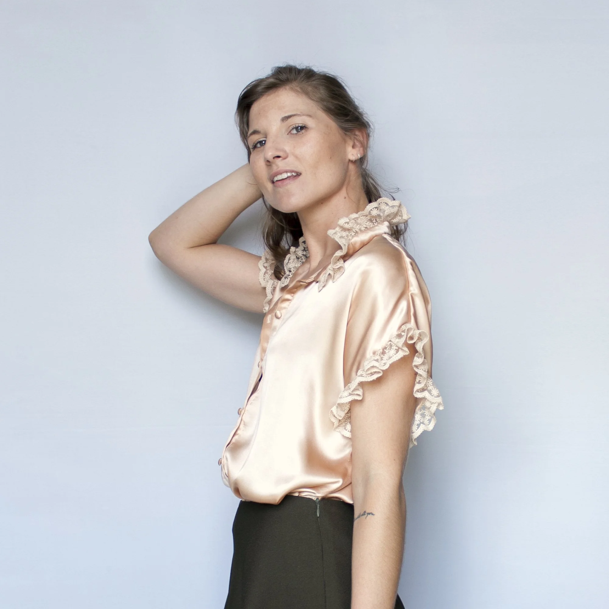 Top exclusivo en raso con pliegues y fajín incorporado.